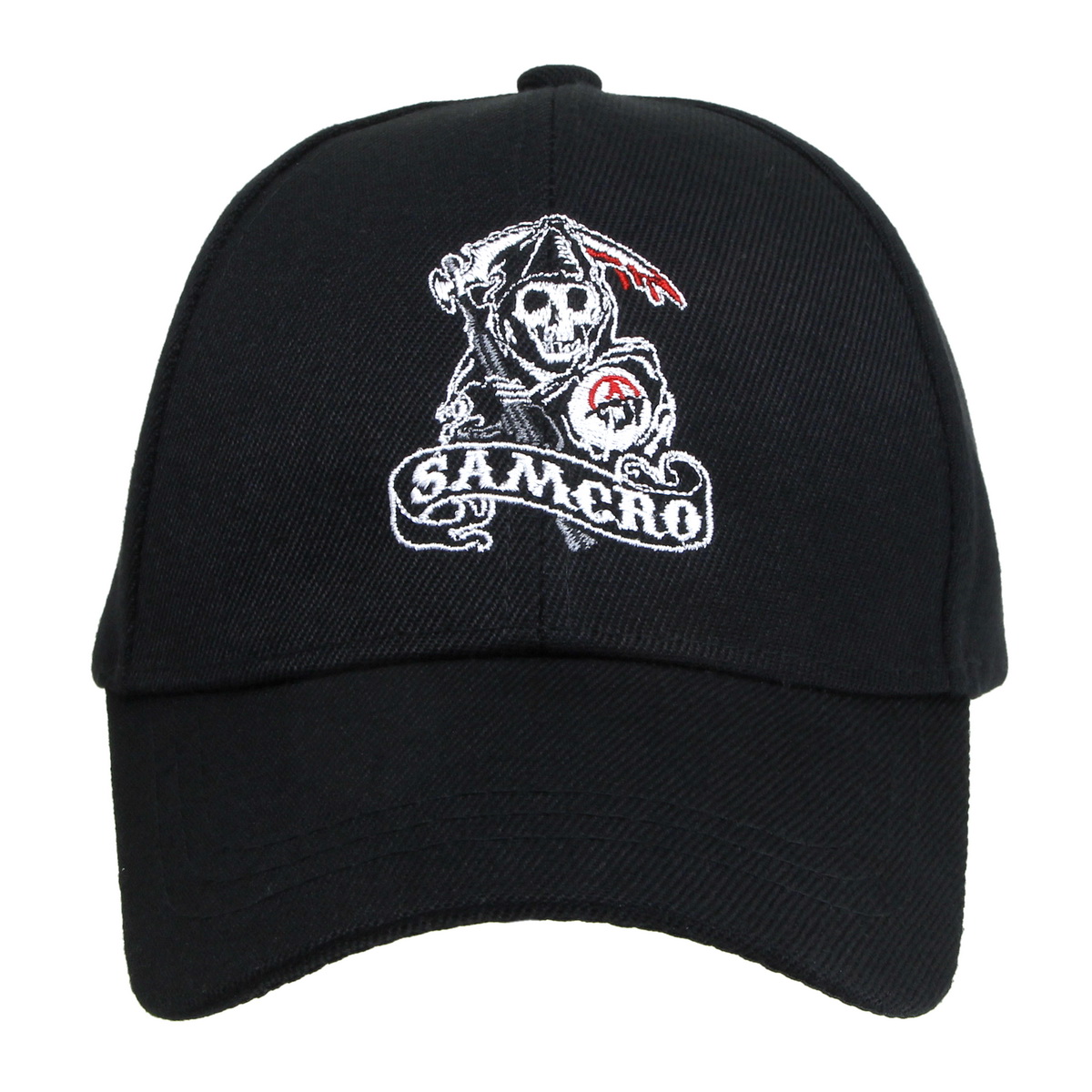 Бейсболка текстильная с вышивкой Sons Of Anarchy. Объем бейсболки ( размер от 55 до 59 ) можно регулировать с затылка при помощи специальной застежки бакла. Материал бейсболки 100% полиэстер. Козырек жесткий,формованный длиной 6,5 см. Глубина бейсболки 12 см +1 см.