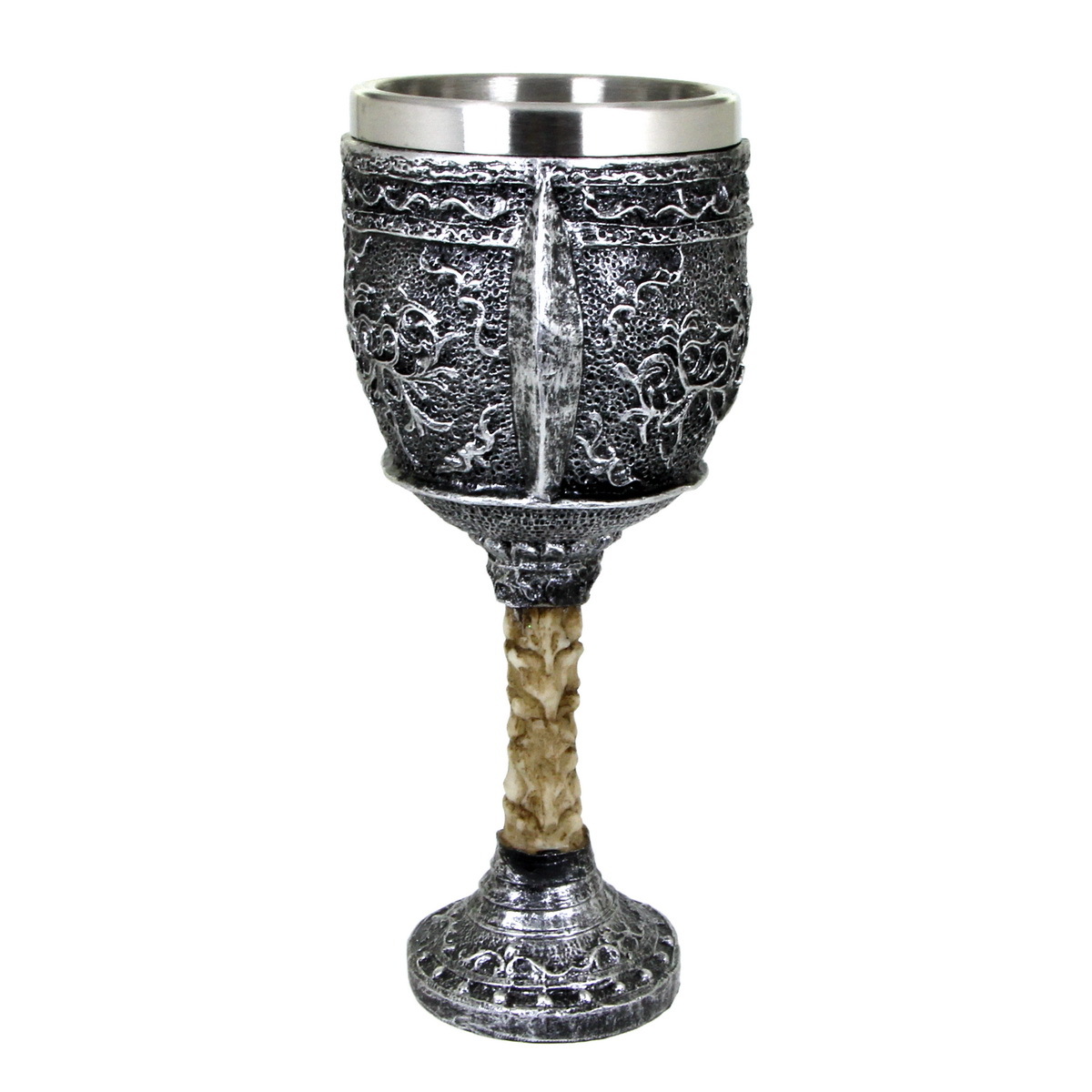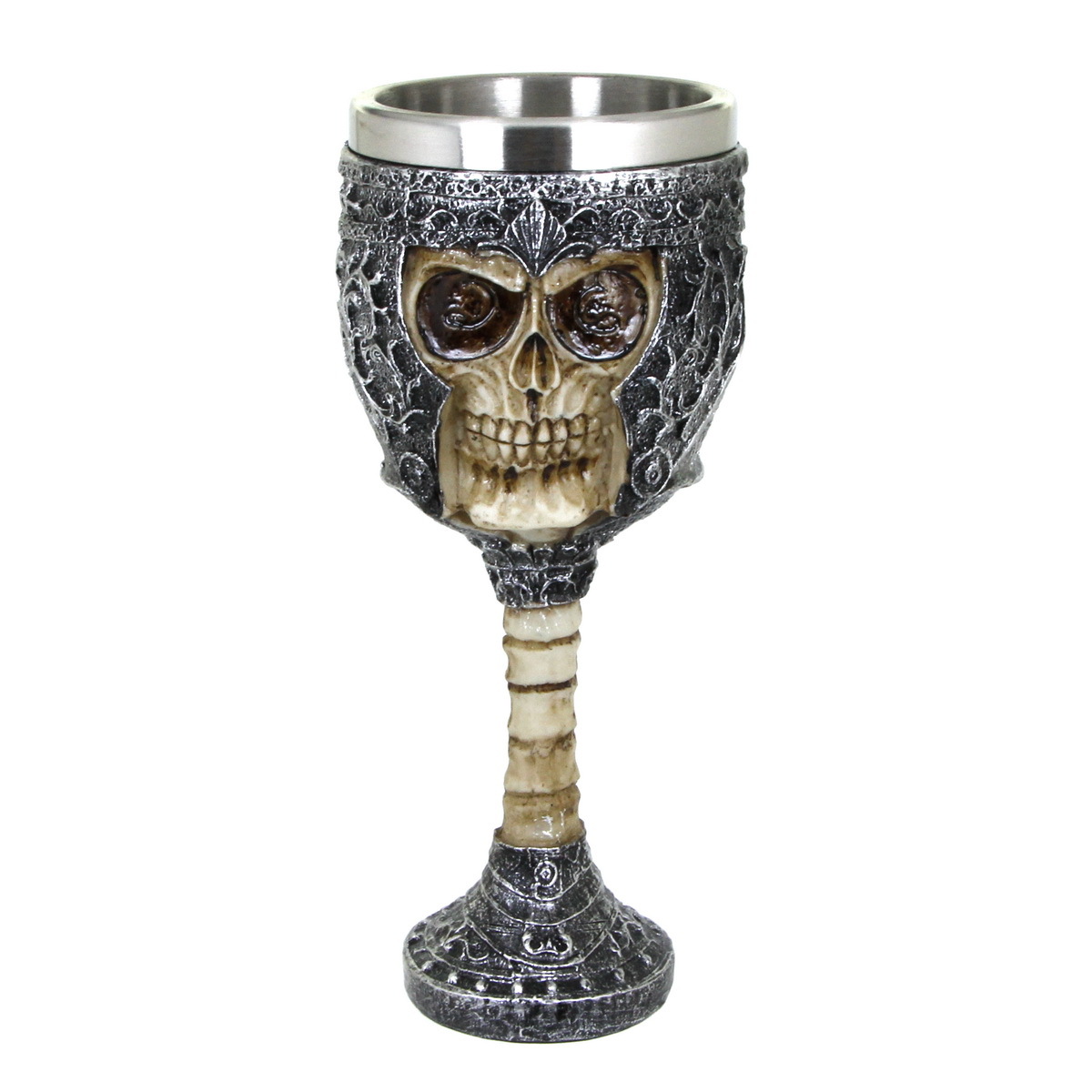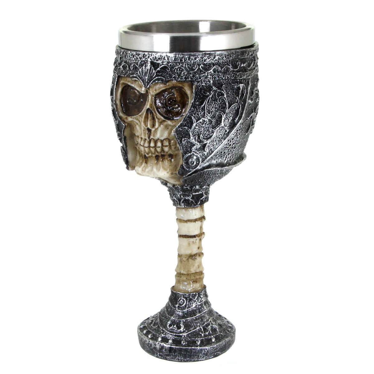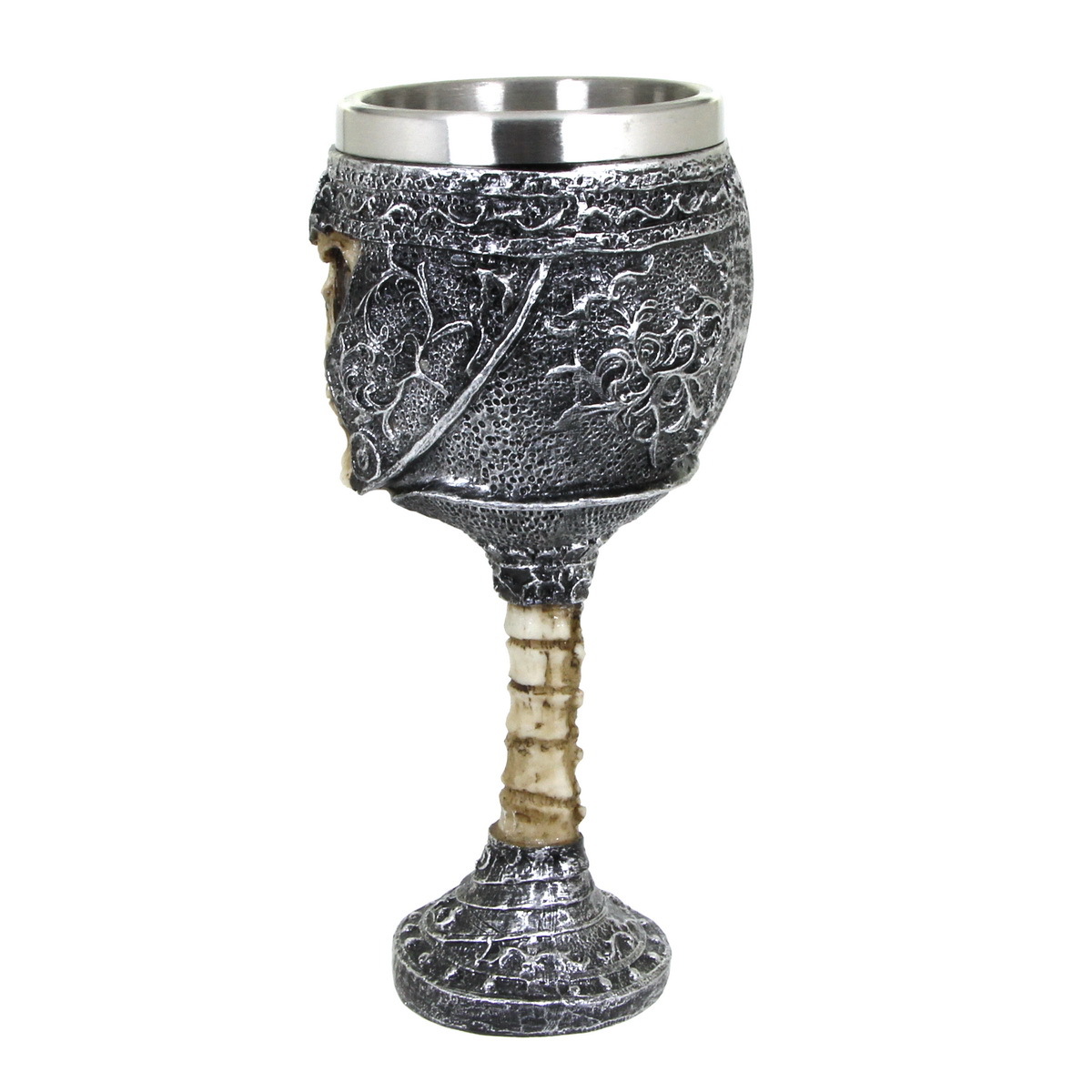 Кубок Череп в шлеме. Материал кубка полистоун (искусственный камень на основе акриловых смол). Стакан изготовлен из нержавеющей стали и вклеен в кубок. Объем стакана 150 мл. Высота кубка 18 см; диаметр 7 см. Производство - Китай.
