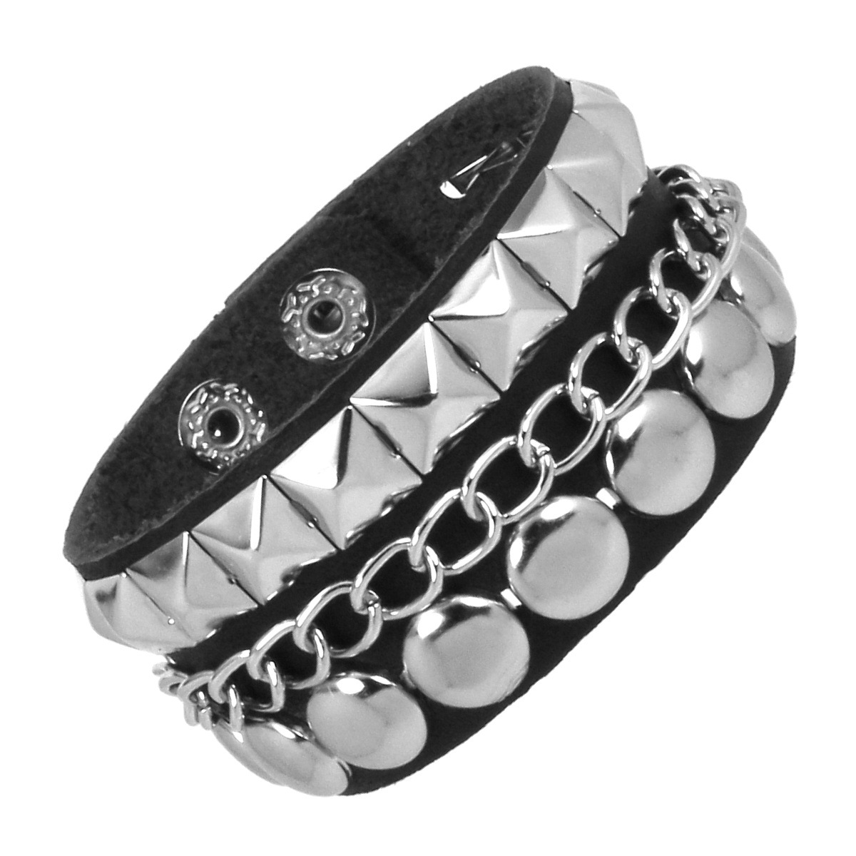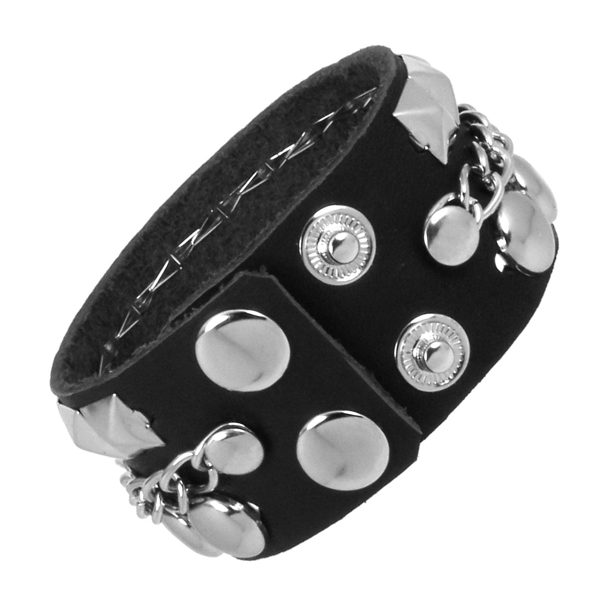 Представляем классический браслет с цепочкой и украшениями в виде пирамид и полусферических клепок, расположенных в один ряд. Он изготовлен из мягкой натуральной седельной кожи, что придает ему особую элегантность и комфорт. Украшения крепятся с помощью загнутых шипов, а цепочка — с помощью хольнитена, что обеспечивает надежную фиксацию и долговечность.