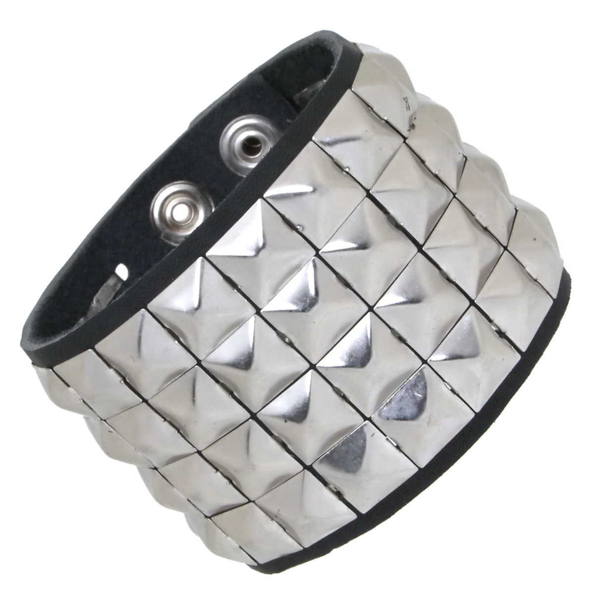 Представляем вам классический браслет, украшенный пирамидами, расположенными в четыре ряда. Он изготовлен из мягкой натуральной седельной кожи, производство Россия. Пирамиды закреплены на браслете с помощью загнутых с внутренней стороны шипов, что придаёт изделию особую комфортность.