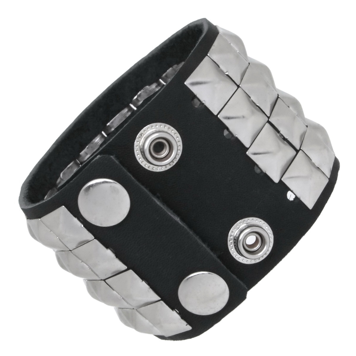 Представляем вам классический браслет, украшенный пирамидами, расположенными в четыре ряда. Он изготовлен из мягкой натуральной седельной кожи. Пирамиды закреплены на браслете с помощью загнутых с внутренней стороны шипов, что придаёт изделию особую комфортность.