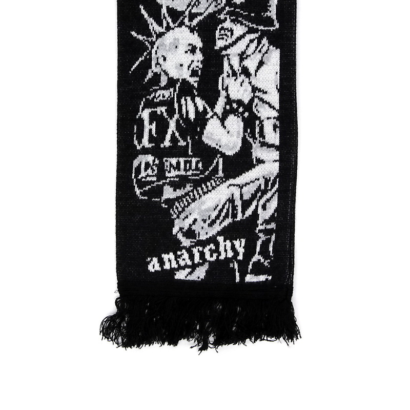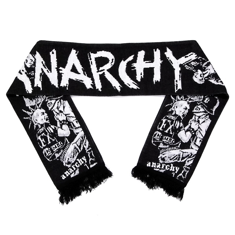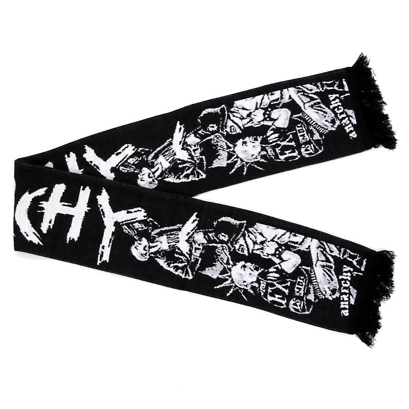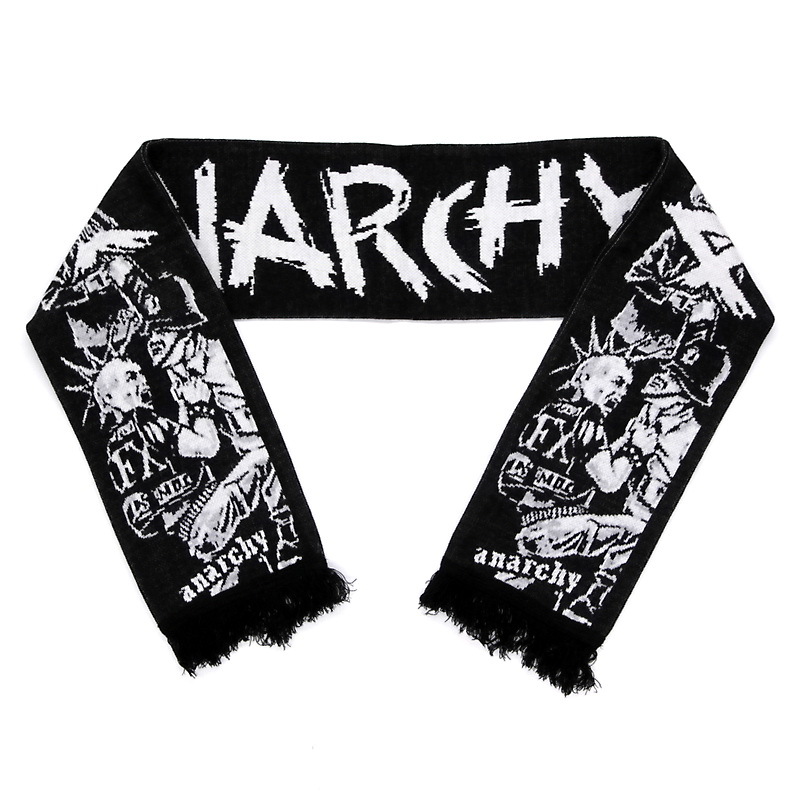 Представляем вашему вниманию зимний шарф Anarchy с жаккардовым рисунком и бахромой. Этот шарф изготовлен из высококачественной акриловой пряжи на промышленных вязальных машинах. Он сложен пополам по длине и сшит.
